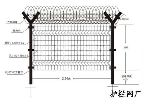 注:如果在機場護欄網(wǎng)頂部加裝刀片刺絲、刀片刺網(wǎng)后又很好的增強了安全防護性能。采用電鍍、熱鍍、噴塑、浸塑等防腐形式,具有很好的抗老化、抗曬、耐腐蝕等特點。其產(chǎn)品造型美觀、花色多樣,既起到圍欄作用,又起到美化作用。由于具有安全性高、防攀爬能力好,網(wǎng)片連接方式采用特制SBS緊扣件,有效防止人為的破壞性拆卸,橫向四道折彎加強筋,使網(wǎng)面強度顯著增加。