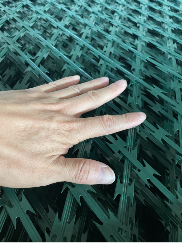 金屬刀刺隔離網(wǎng)主要用于圍墻、獄墻、巡邏道,網(wǎng)孔是7.5cm*15cm選擇bt0-22型號(hào)刀片刺條焊接而成。表面做噴涂處理,顏色有草綠色、墨綠色、中灰色等。