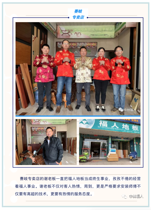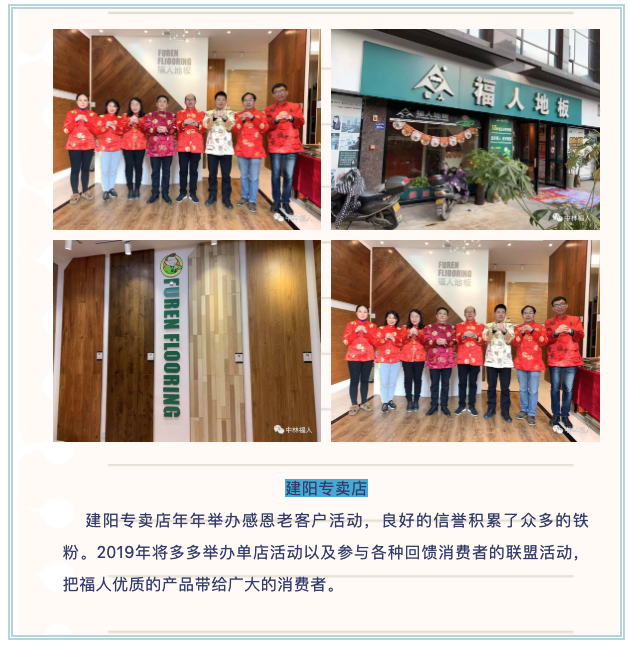 此次八閩行的主題——不忘初心,砥礪前行,福人地板百千萬工程新紀(jì)元。此次活動是公司組織走訪福建各區(qū)域,與優(yōu)秀經(jīng)銷商進(jìn)行溝通交流行業(yè)發(fā)展、目前存在的問題及解決方案,并統(tǒng)一思想,努力做好品牌價值鏈的傳遞,廠商結(jié)合共同服務(wù)消費者,提高消費者的消費體驗,使福人地板成為以消費者為中心的踐行者。各專賣店詳情如下: