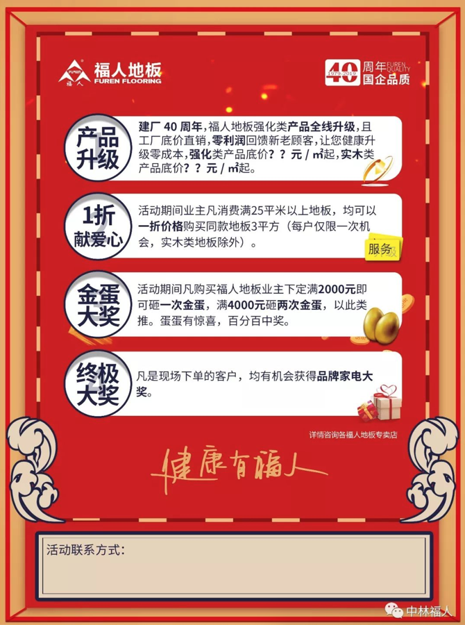 建廠40周年,福人地板強化類產品全線升級,且工廠底價直銷,零利潤回饋新老顧客,讓您健康升級零成本,強化類產品底價??元/㎡起,實木類產品底價??元/㎡起。