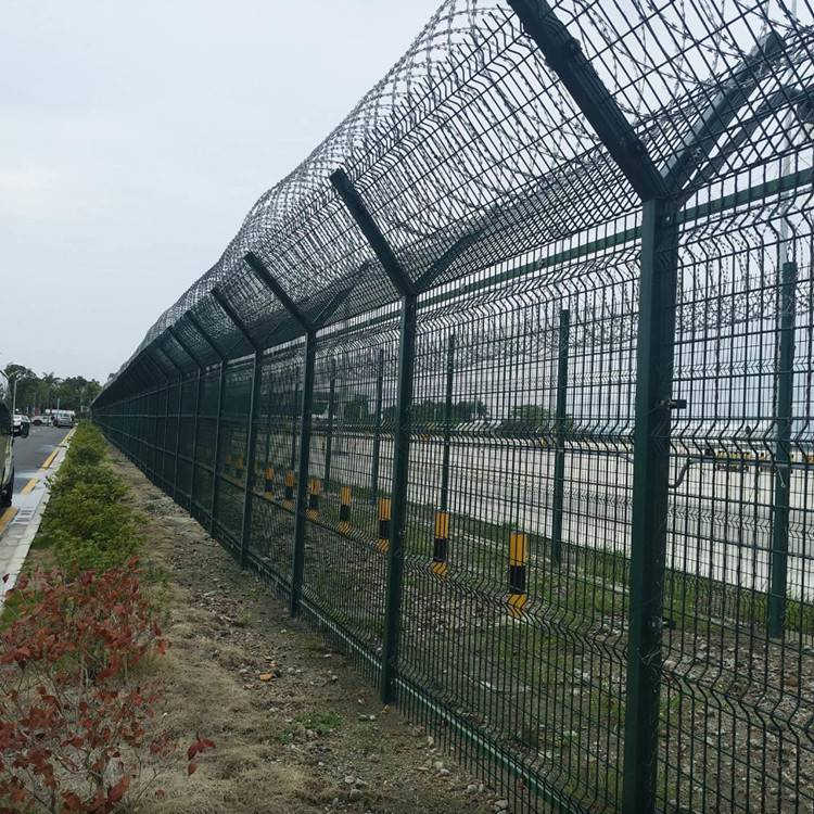 機(jī)場圍界網(wǎng)常用的兩種結(jié)構(gòu)樣式有有雙邊絲款及框架款隔離網(wǎng),而2.5米高民用機(jī)場圍界網(wǎng)是一種高安全隔離防護(hù)網(wǎng),一般由鋼筋焊接網(wǎng)、Y型防護(hù)立柱以及蛇腹式刀刺網(wǎng)等幾大主體組成。不但有良好的通透性,又能起到強(qiáng)有力的安全隔離防護(hù)效果,發(fā)揮著保護(hù)機(jī)場強(qiáng)有力的作用。