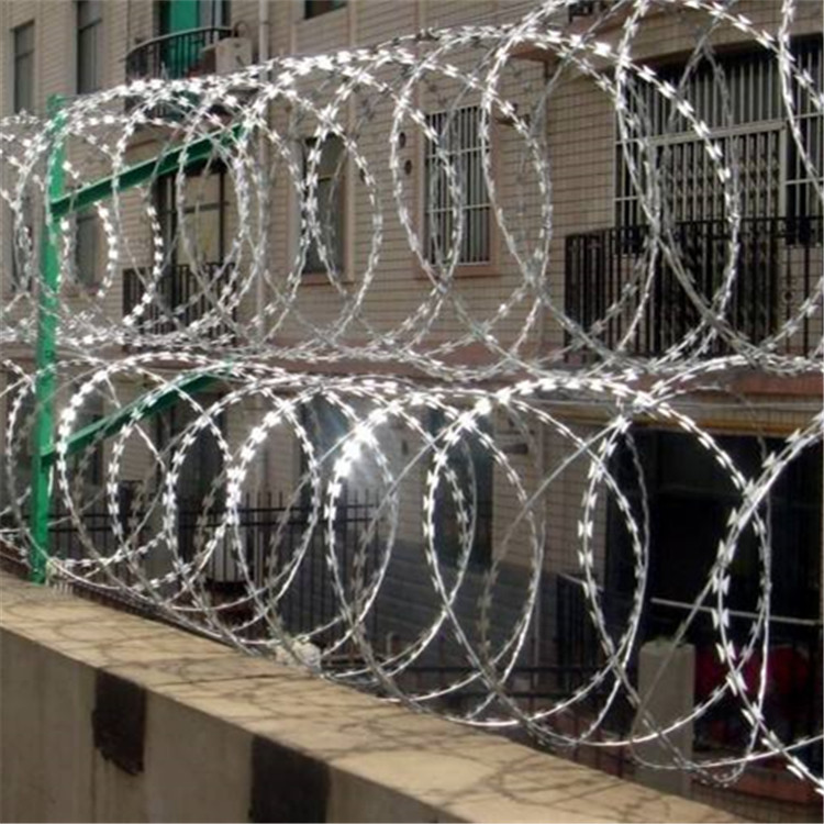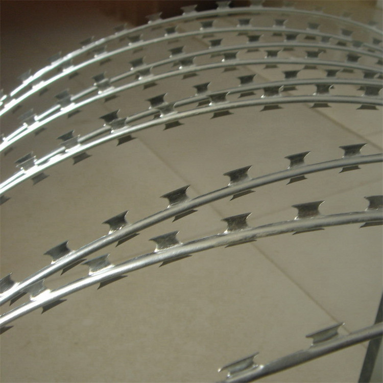 工藝:它采用鋼板(刀板)沖壓成型包附于熱鍍鋅鋼絲(芯線)之上,由銳利尖角鍍鋅鋼板或不銹鋼薄板做刀片,高張力鋼絲做芯線組合而成的。