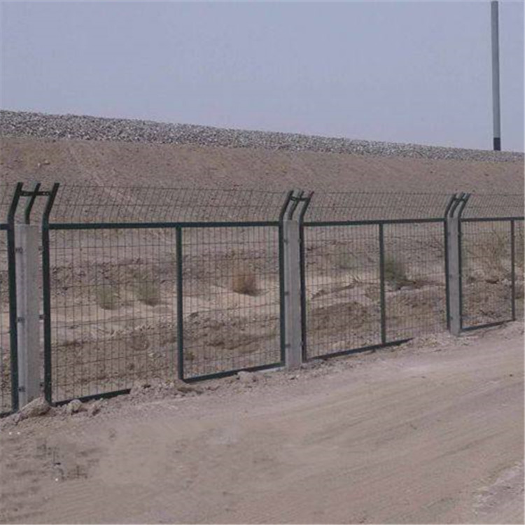 3、人口稀少地區設置型式當鐵路穿越山區、戈壁等常年沒有人、畜通行的地段,在這些地方設置鋼筋混凝土防護柵欄成較高,且利用率較低。本著經濟合理的原則,可以考慮在這些地區設置1. 8 m 高鋼筋混凝土立柱金屬網片防護柵欄