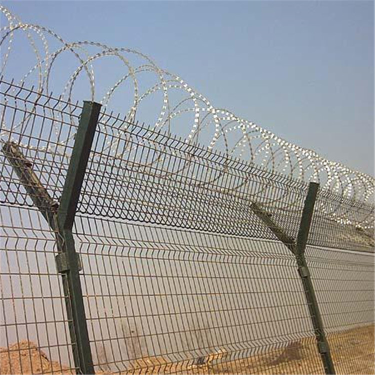 監(jiān)獄金屬隔離網(wǎng)墻又稱作“Y型安全防御護網(wǎng)”,是由V型支架立柱,加強型焊接片網(wǎng),安全防盜連接件和熱鍍鋅刀片刺籠組成強度和安全防御性級別很高。近年來,被廣泛應用在監(jiān)獄,軍事基地等高安全場所。在監(jiān)獄金屬隔離網(wǎng)墻頂部加裝刀片剌絲、刀片剌繩后又很好的增強了安全防護性能。