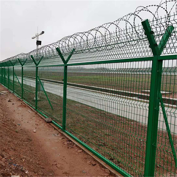 機(jī)場(chǎng)鋼筋網(wǎng)圍界又稱作“機(jī)場(chǎng)護(hù)欄”、“Y型安全防御護(hù)網(wǎng)”,它是由V型支架立拄,加強(qiáng)型焊接片網(wǎng),安全防盜連接件和熱鍍鋅刀片剌籠組成。