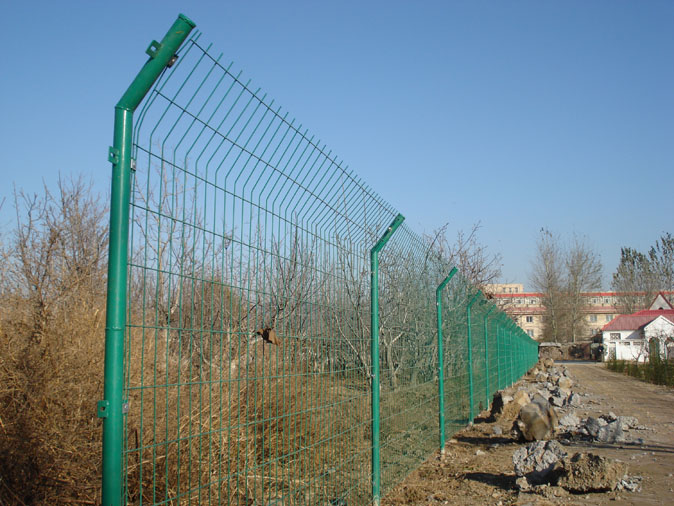 圈山地護欄網是由雙邊絲網片與立柱直接連接的方式,安裝簡單,立柱在地面或者磚墻進行洗筑固定,美觀簡單、通透。成本比較低。圍山地護欄網材料:鐵質鋼材,表面熱浸塑防腐處理。
