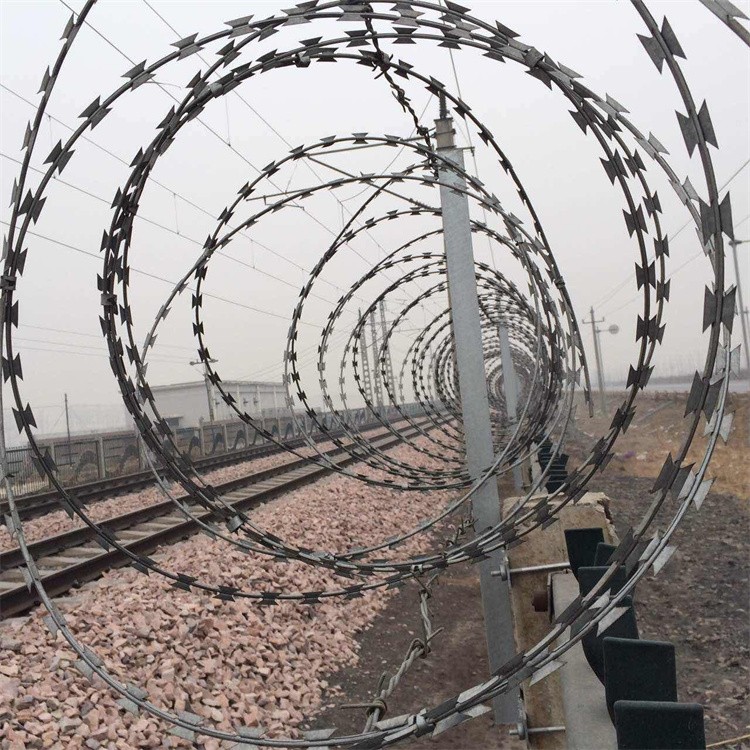 刀片刺網在監獄看守所應用一般叫刀刺網,也可焊接成網片的,叫焊接刀刺網,應用在高鐵叫刺絲滾籠,也可用在邊境稱之為邊境防護網 它的用途極為廣泛,廣泛用于監獄、高鐵、學校、 別墅、小區、邊境線、公共場所、高速公路等圍墻防護。