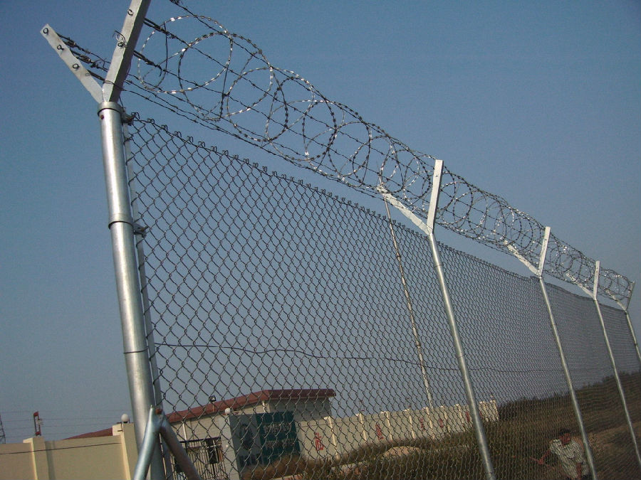 柵欄立柱上方安裝Y型曲臂,曲臂上安裝刺刀籠,并由刺絲進(jìn)行固定。