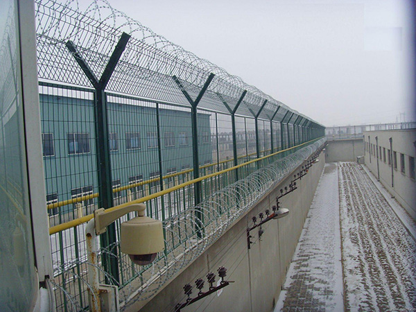 安全防盜連接件和熱鍍鋅刀片刺籠組成強度和安全防護性級別是很高的。關于立柱, 希望有用性強一些,因為終年的刮風下雨惡劣的氣候條件下都能耐久的立于崗位上。監獄護欄網又稱作”Y型安全防護護網。