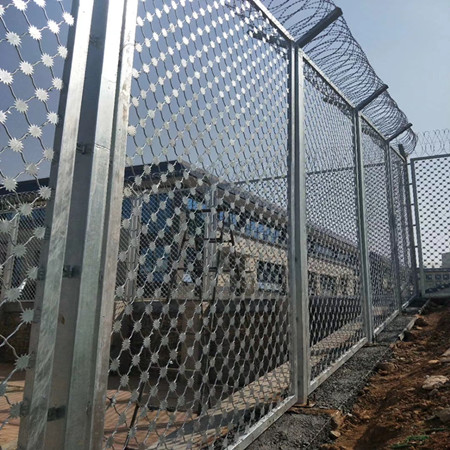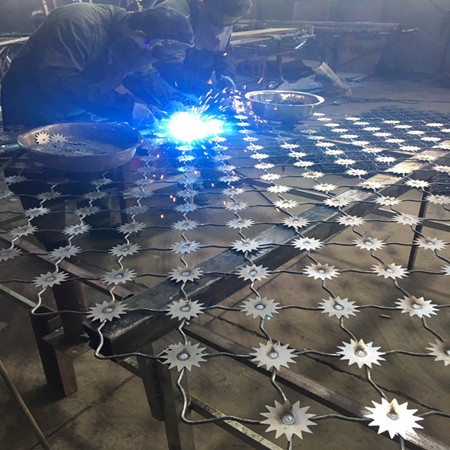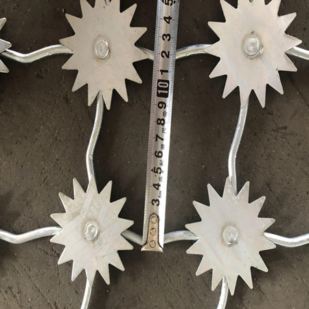 1、梅花刺片:梅花剌片直徑不小于7.5cm (直徑6cm、7cm、8cm) ,刺片厚1.5mm ,采.用Q235低碳鋼板沖壓成型。梅花刺片用氬弧焊將梅花形刺片焊接在美格網(wǎng)的節(jié)點上,形成刺形保護,有效的防止了手握腳攀。