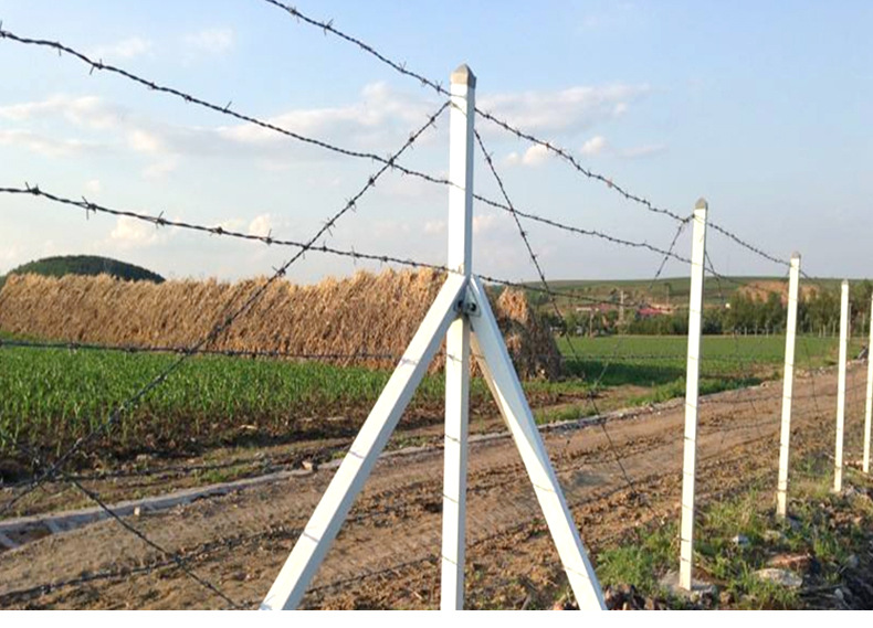 5、T字型邊境鐵絲網(wǎng),"T型網(wǎng)樁刺鐵絲按側(cè)部14道橫絲,2道斜拉絲,頂部5道橫絲的標(biāo)準(zhǔn)架設(shè),側(cè)培刺鐵絲間距15厘米,底部刺鐵絲距離地面距離為5厘米,頂部刺鐵絲間距為20厘米,相鄰兩個(gè)立樁之間斜拉刺鐵絲與水平刺鐵絲交叉處用專用卡扣固定,方型鋼樁刺鐵絲側(cè)部按14道橫絲, 2道斜拉絲,頂部3道橫絲的標(biāo)準(zhǔn)架設(shè),側(cè)培刺鐵絲間距為15厘米,底部刺鐵絲距離地面距離為5厘米,頂部刺鐵絲間距為12.4厘米,相鄰兩個(gè)立樁之間斜拉刺鐵絲與水平刺鐵絲交叉處用專用卡扣固定。